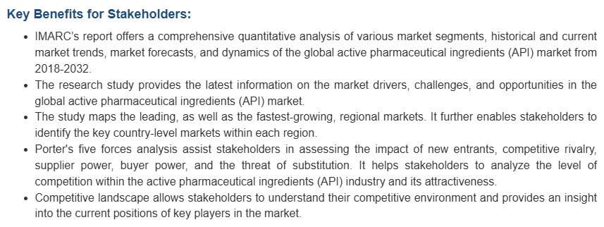 이 시장 조사 보고서는 또한 시장의 경쟁 구도에 대한 포괄적인 분석을 제공합니다. 시장 구조, 주요 업체 포지셔닝, 최고의 성공 전략, 경쟁 대시보드, 기업 평가 사분면과 같은 경쟁 분석이 이 보고서에서 다루어졌습니다. 또한, 모든 주요 기업에 대한 자세한 프로필이 제공되었습니다. 활성 제약 성분(API) 산업의 주요 시장 참여자 중 일부는 Pfizer, Inc., Novartis International AG, Sanofi, Boehringer Ingelheim, Bristol-Myers Squibb, Teva Pharmaceutical Industries Ltd. , ELI Lilly and Company, GlaxoSmithKline, Merck & Co., Inc., Abbvie Inc 등이 있습니다.
