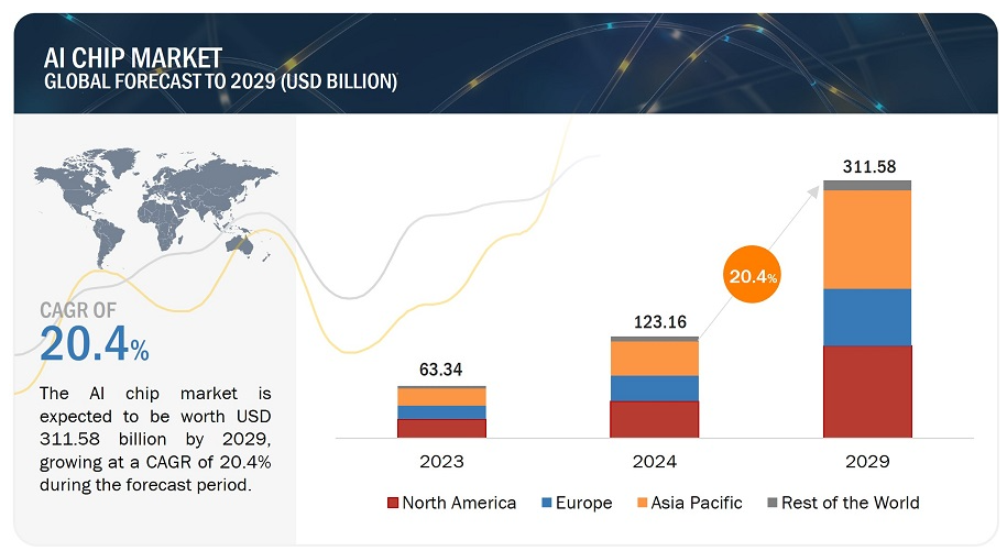 BFSI, 의료, 리테일, 이커머스, 미디어, 엔터테인먼트, 자동차 등 여러 산업에서 다양한 AI 기반 애플리케이션에 AI 서버의 도입이 증가함에 따라 AI 칩에 대한 수요가 급증하고 있습니다. 데이터센터 소유자와 클라우드 서비스 제공업체는 AI 애플리케이션을 지원하기 위해 인프라를 업그레이드하고 있습니다. MarketsandMarkets의 분석에 따르면 2023년 AI 서버 보급률은 전체 서버의 8.8%를 차지했으며 2029년에는 30%에 달할 것으로 예상됩니다. 챗봇, 사물인터넷(AIoT), 예측 분석, 자연어 처리를 사용하는 경향이 증가함에 따라 이러한 애플리케이션을 지원하기 위한 AI 서버의 필요성이 커지고 있습니다. 이러한 애플리케이션은 복잡한 연산을 수행하고 대량의 데이터를 처리하기 위해 강력한 하드웨어 플랫폼이 필요합니다.