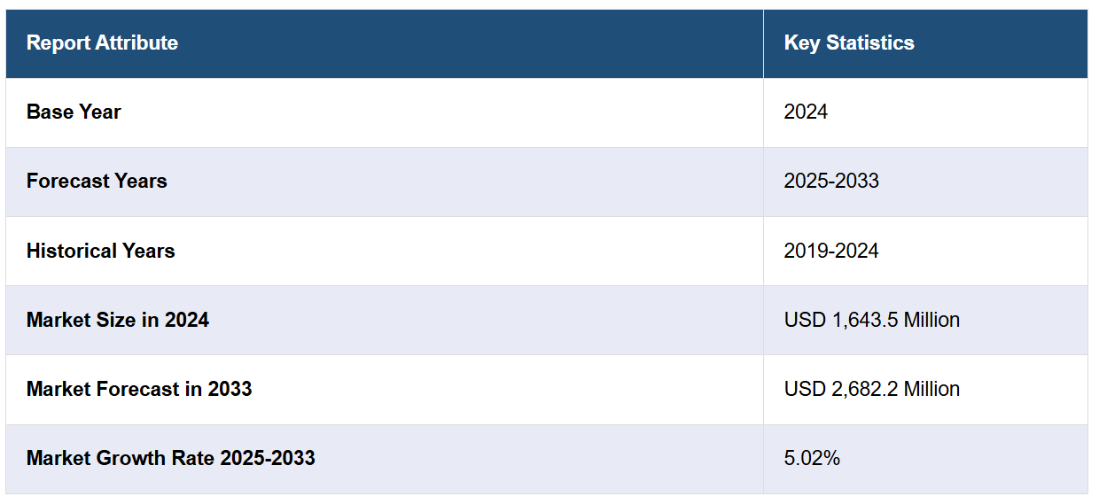 한국 자동차 배선 하네스 시장 규모는 2024년 1,643.5 백만 달러 에 달했습니다. 향후 전망으로는 2033년 2,682.2 백만 달러 에 이를 것으로 예상되며, 2025년부터 2033년까지 연평균 성장률(CAGR) 5.02% 를 기록할 전망입니다. 차량 전자장비의 발전, 전기 및 자율주행 시스템의 통합, 강화된 안전 및 연결성 기준에 힘입어 시장이 확대되고 있다. 공급업체들은 현대적 자동차 수요를 충족시키기 위해 경량 소재, 모듈식 설계, 스마트 하네스 솔루션으로 혁신을 추진 중이다. 이러한 발전들은 종합적으로 한국 자동차 배선 하네스 시장 점유율을 강화하고 있다.
