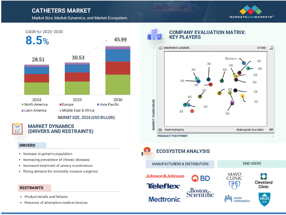 인도, 중국, 브라질, 동남아시아 국가를 포함한 신흥 시장은 일회용 소득의 증가, 의료 인프라의 개선, 만성 질환의 부담 증가에 힘입어 카테터 산업에 상당한 성장 기회를 제공하고 있습니다. The Lancet (2024)은 2050년까지 아시아에서 심혈관 질환으로만 7억 2,900만 명 이상이 영향을 받을 것으로 전망하며, 이로 인해 중재적 심장학 카테터에 대한 수요가 크게 증가할 것으로 예상합니다. 이 지역의 정부들은 증가하는 의료 수요를 충족하기 위해 병원 확장, 의료 기기 접근성 개선, 현지 카테터 제조 촉진에 적극적으로 투자하고 있습니다. 민관 협력과 건강 보험의 보급도 환자들이 카테터 기반 시술을 받기 쉽게 하고 있습니다. 브라질이 2023년에 혁신적인 풍선 카테터로 성공을 거둔 것은 이 지역이 제품 개발 및 채택을 추진할 수 있는 능력을 잘 보여주는 예입니다. 의료 관광도 카테터 수요 증가에 기여하고 있습니다. 주변 국가에서 환자들이 신흥 경제국에서 저렴하고 선진적인 치료를 받기 위해 방문하기 때문입니다. 또한, 디지털화 및 최소 침습 기술의 채택을 포함한 의료 현대화 노력도 카테터 시장의 확장을 가속화하고 있습니다. 정부의 지원 정책, 유리한 규제 개혁, 외국인 투자 증가에 힘입어 이러한 신흥 시장은 글로벌 카테터 산업의 중요한 성장 동력이 될 것으로 예상되며, 제조업체와 의료 서비스 제공업체에 중요한 기회를 제공할 것입니다.