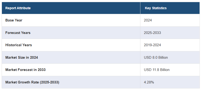전 세계 도징 펌프 시장 규모는 2024년에 80억 달러에 달할 것으로 예상됩니다. IMARC 그룹은 2033년까지 시장 규모가 미화 118억 달러에 달할 것으로 예상하고 있으며, 2025-2033년 동안 연평균 성장률(CAGR)이 4.28%에 달할 것으로 전망하고 있습니다. 환경 및 안전 규정 준수, 수질에 대한 우려 증가, 대중의 효과적인 수처리 솔루션에 대한 요구, 급속한 산업화, 그리고 번창하는 의료 및 제약 산업으로 인해 시장은 완만한 성장을 보이고 있습니다.