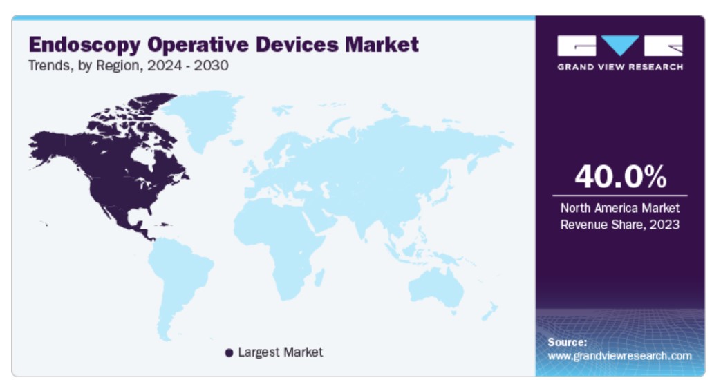 북미 내시경 수술 기기 시장은 2023년 전 세계 내시경 수술 기기 시장에서 40.0% 이상의 가장 큰 매출 점유율을 차지했습니다. 이 지역의 시장 성장은 선진 의료 인프라, 첨단 기술의 광범위한 채택, 위장 장애 및 만성 질환의 높은 유병률에 힘입었습니다. 노령 인구 증가와 회복 기간 단축 및 합병증 발생률 감소 효과를 제공하는 최소 침습 수술에 대한 관심도 이 지역의 시장 지배력에 기여하고 있습니다.