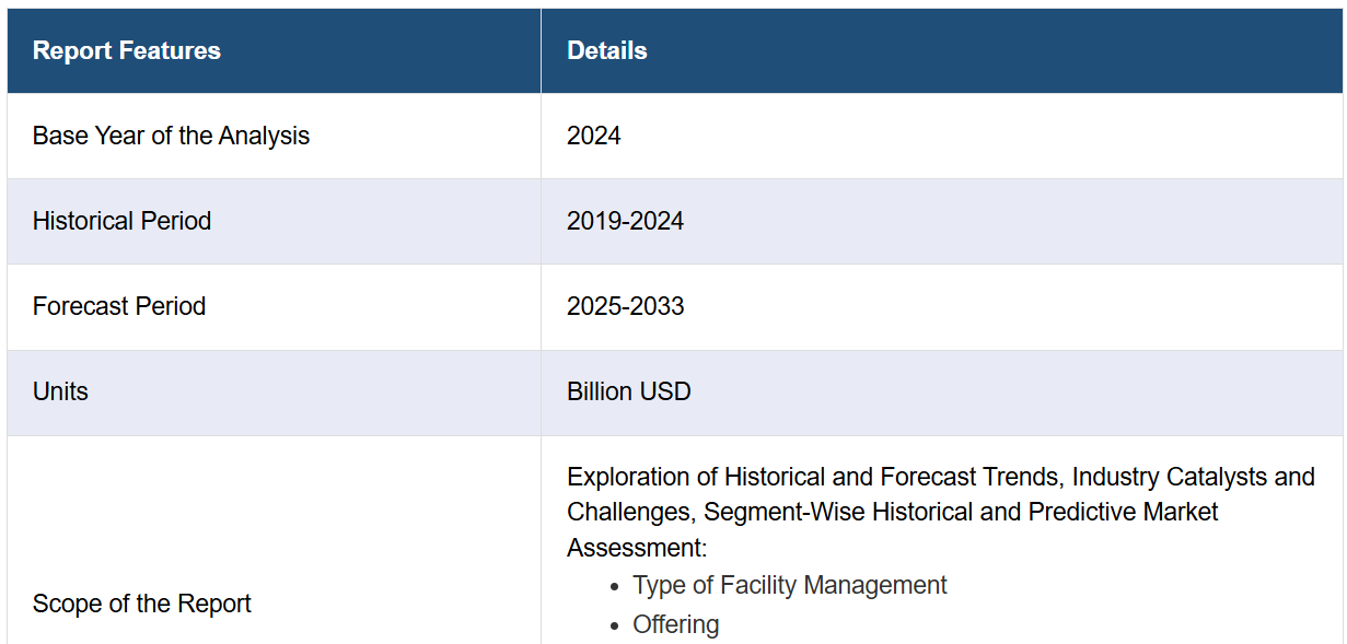 IMARC Group은 시장 각 부문의 주요 동향 분석과 함께 2025-2033년 국가별 전망을 제공합니다. 본 보고서는 시설 관리 유형, 제공 서비스, 최종 사용자 기준으로 시장을 분류하였습니다.