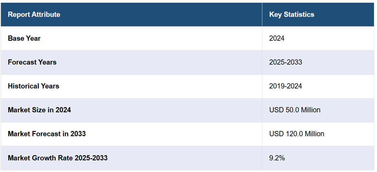 한국 유방촬영 시장 규모는 2024년 50.0 백만 달러 에 달했습니다. 향후 전망으로, IMARC 그룹은 시장이 2033년 120.0 백만 달러 에 이를 것으로 예상하며, 2025-2033년 기간 동안 9.2% 의 성장률(CAGR)을 보일 것으로 전망합니다. 유방암 유병률 증가, 유방촬영 장비의 상당한 기술 발전, 의료 이니셔티브에 대한 정부 지원, 고령화 인구, 예방 의료 관행의 증가 추세 등이 시장을 주도하는 주요 요인으로 꼽힌다.