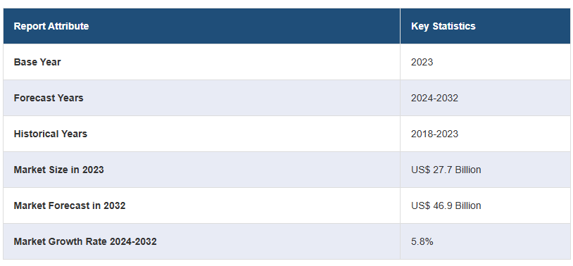 전 세계 의료용 플라스틱 시장 규모는 2023년에 277억 달러에 달했습니다. 앞으로 IMARC 그룹은 2024~2032년 동안 5.8%의 성장률(CAGR)을 보이며 2032년까지 시장 규모가 469억 달러에 달할 것으로 예상하고 있습니다. 의료 기기 및 장비에 대한 수요 증가, 만성 질환 유병률 증가, 엄격한 규제 기준, 노인 인구 증가, 감염 예방을 강조하는 COVID-19 팬데믹, 기술 발전, 최소 침습 수술(MIS) 절차 등이 시장에 대한 긍정적인 전망을 만드는 요인 중 일부입니다.