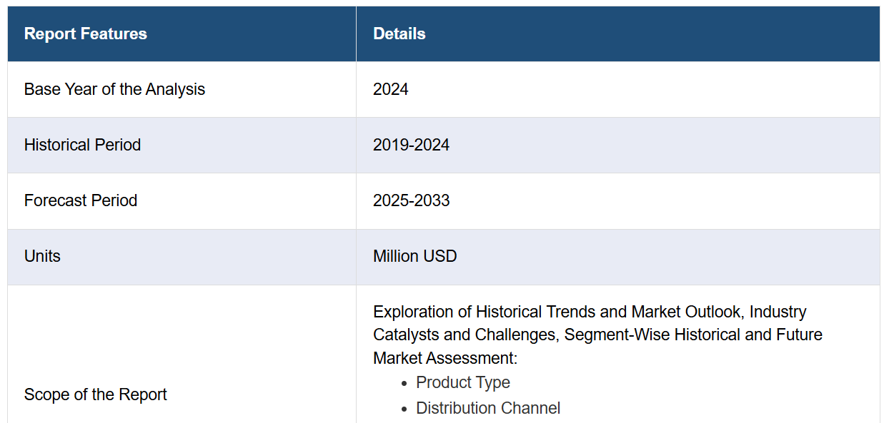 IMARC Group은 시장 각 부문의 주요 동향 분석과 함께 2025-2033년 국가별 전망을 제공합니다. 본 보고서는 제품 유형, 유통 채널, 적용 분야별로 시장을 분류하였습니다.