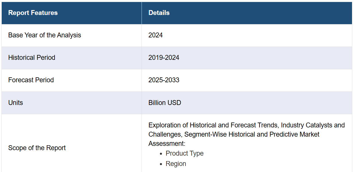 IMARC Group은 시장 각 세그먼트의 주요 동향 분석과 함께 2025-2033년 국가별 예측을 제공합니다. 본 보고서는 제품 유형에 따라 시장을 분류하였습니다.