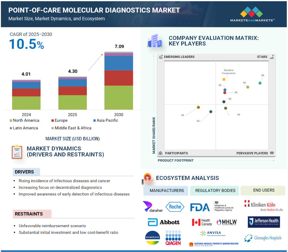 2024년에 40억 1천만 달러로 평가된 글로벌 현장 진단 분자 진단 시장은 2025년에 43억 달러를 기록했으며, 2025년부터 2030년까지 10.5%의 탄탄한 연평균 성장률을 보이며 성장할 것으로 예상되며, 이 기간이 끝날 무렵에는 70억 9천만 달러의 가치에 도달할 것으로 전망됩니다. 이 시장은 신속하고 접근 가능한 검사 솔루션에 대한 수요 증가로 인해 강한 성장세를 보이고 있습니다. 주요 요인으로는 감염성 질환과 암의 발생률 증가가 있으며, 이는 빠르고 신뢰할 수 있는 진단에 대한 수요를 촉진하고 있습니다. 또한 분산형 검사로의 전환이 가속화되고 있으며, 이는 환자에게 진단을 더 쉽게 접근 가능하게 만들기 위한 연구 개발 자금 지원이 증가함에 따라 지원받고 있습니다. 이는 특히 원격 지역이나 자원 부족 지역에서 특히 중요합니다.