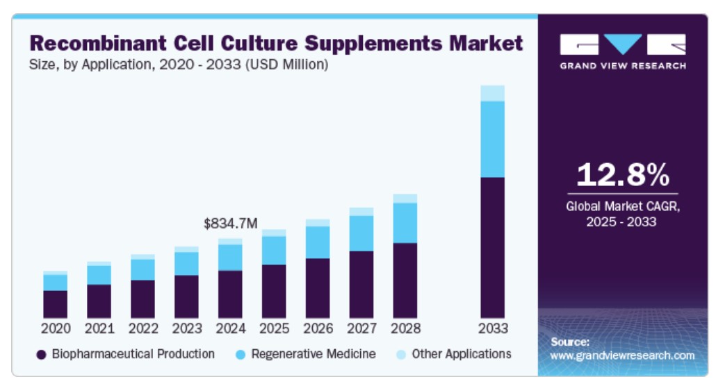또한, 생물학적 제제, 백신, 세포 기반 치료법을 포함한 바이오 의약품에 대한 전 세계 수요가 증가함에 따라, 첨단 세포 배양 보조제에 대한 필요성도 증가하고 있습니다. 이러한 첨단 보충제는 세포 성장을 촉진하고, 단백질 생산량을 최적화하며, 궁극적으로 고품질 생산을 지원하는 세포 생존력을 보장하기 때문에 바이오 제조에 매우 중요합니다. 바이오 제약 회사가 의료 수요를 충족하기 위해 규모를 확장함에 따라, 세포 배양 보충제는 생산성과 제품 일관성을 향상시키는 데 핵심적인 역할을 합니다. 따라서 예측 기간 동안 재조합 세포 배양 보충제에 대한 수요가 증가할 것으로 예상됩니다.