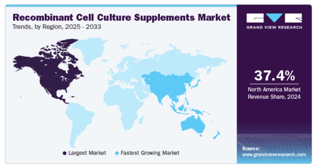 북미 재조합 세포 배양 보조제 시장은 2024년 37.43%의 점유율로 시장을 지배하고 있습니다. 이 지역은 강력한 바이오 제약 산업, 생명공학 연구개발에 대한 상당한 투자, 생물학적 제제 및 세포 기반 치료법을 지원하는 잘 구축된 규제 체계를 갖추고 있습니다. 주요 제약 회사와 첨단 의료 인프라의 존재는 예측 기간 동안 시장 성장을 더욱 촉진했습니다.