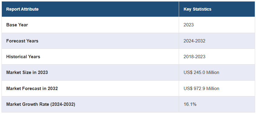 전 세계 레독스 플로우 배터리 시장은 2023년에 2억 4,500만 달러 규모로, 2032년까지 9억 7,290만 달러에 이를 것으로 예상되며, 이 기간 동안 연평균 성장률(CAGR)은 16.1%에 이를 것으로 보입니다. 이러한 성장은 재생 에너지 통합의 증가, 대규모 에너지 저장 솔루션의 필요성, 전력망 현대화에 대한 투자 증가, 배터리 기술의 지속적인 발전에 기인하고 있습니다.