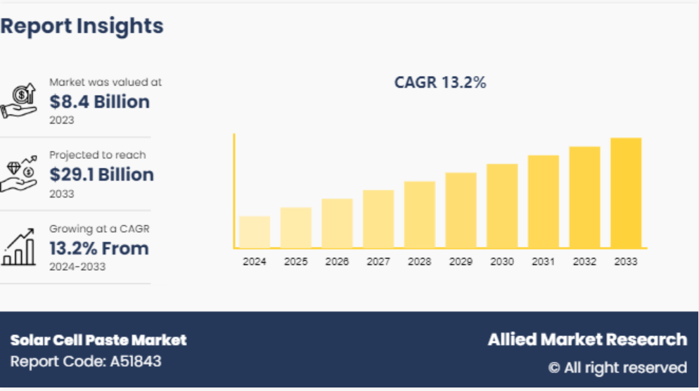 2023년 세계 태양 전지용 페이스트 시장의 규모는 84억 달러였으며, 2033년에는 291억 달러에 이를 것으로 예상되며, 2024년부터 2033년까지 연평균 13.2%의 성장률을 보일 것으로 전망됩니다.