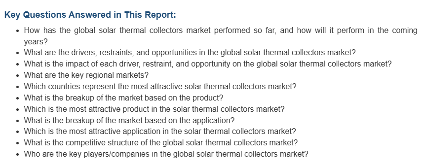 주요 업체들은 환경에 대한 인식이 높아지고 전 세계적으로 전력 소비가 증가함에 따라 태양열 집열기에 대한 수요가 증가하고 있습니다. 또한, 제품을 제조하고 모든 사람이 사용할 수 있도록 비용 효율적인 대체 재료를 활용하는 데 상당한 노력을 기울이고 있습니다. 주요 기업들은 태양 복사열을 수집하고 열 에너지를 집중시키는 데 고반사 재료를 활용하는 혁신적이고 효율적인 태양열 집열기를 개발하기 위해 연구 활동에 막대한 투자를 하고 있습니다. 또한, 다른 브랜드와 협력하여 생산 시설을 확장하고 판매량을 늘리고 있습니다. 더 나아가, 선도 기업들은 더 많은 고객과 연결하고 시장에서 안정적인 위치를 유지하기 위해 파트너십과 인수에 집중하고 있습니다.