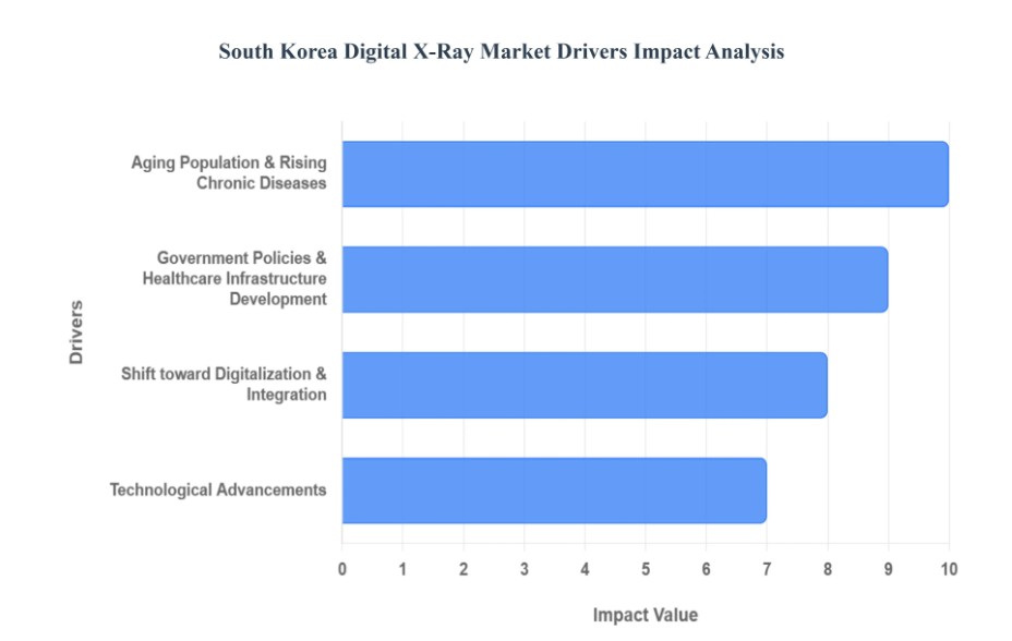 한국 디지털 X선 시장은 인구 구조 변화, 급속한 기술 혁신, 강력한 정부 지원, 전국적인 디지털 의료 전환 추진이 복합적으로 작용하며 상당한 성장을 경험하고 있습니다. 디지털 X선 시스템(디지털 방사선 촬영, DR)은 기존 필름 기반 시스템 대비 우수한 효율성, 화질, 통합 기능을 제공하여 진화하는 국내 진단 환경에서 필수 도구로 자리매김하고 있습니다. 이 역동적인 분야에서 기회를 활용하려는 이해관계자들에게는 이러한 핵심 시장 동인들을 이해하는 것이 매우 중요합니다.