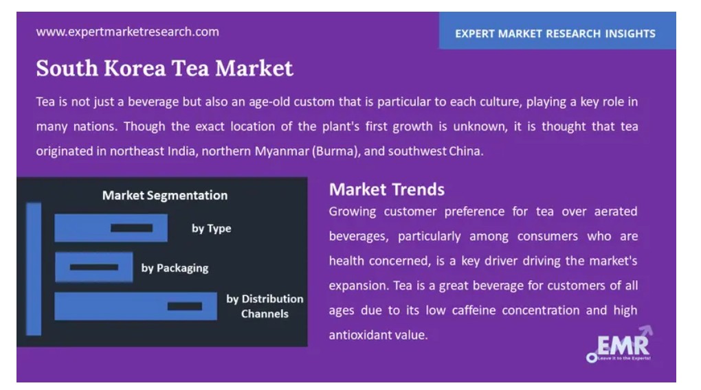 친환경 포장 옵션에 대한 소비자 수요 증가가 한국 차 산업의 성장을 촉진하고 있습니다. 진정 효과와 향기로운 음료에 대한 수요 증가가 한국 차 산업의 성장을 이끌고 있습니다. 시장 확장에 영향을 미치는 주요 요인으로는 글로벌화 확대, 건강 혜택에 대한 인식 증가, 라이프스타일 상품 수요 증가, 가처분 소득 증가 등이 있습니다.
