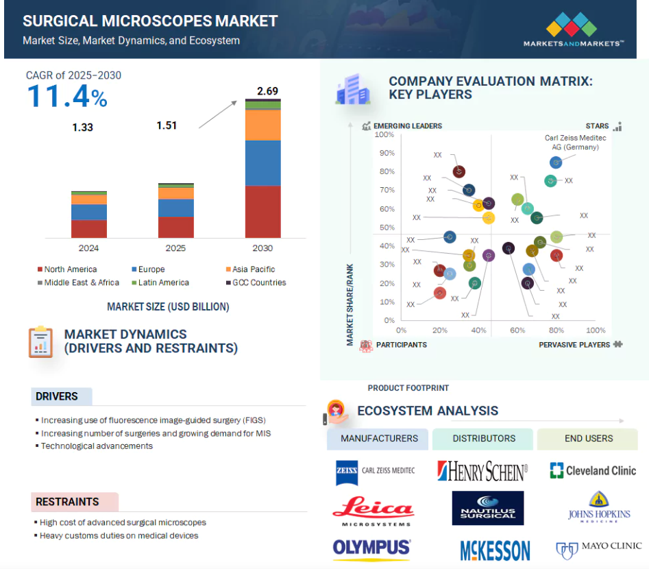 전 세계 수술용 현미경 시장은 2024년 US$1.33억 달러로 평가되었으며, 2025년에는 US$1.51억 달러로 성장했으며, 2025년부터 2030년까지 11.4%의 견고한 연평균 성장률(CAGR)로 성장해 해당 기간 종료 시 US$2.69억 달러에 달할 것으로 전망됩니다. 수술용 현미경은 환자 및 외과의사 모두에게 상당한 이점을 제공함으로써 정밀 수술을 혁신하고 있습니다. 전통적인 방법에 비해 향상된 확대율, 조명, 인체공학적인 디자인을 제공하여 더 높은 정밀도, 합병증 감소, 빠른 회복을 가능하게 합니다. 형광 이미징 및 증강 현실과 같은 고급 기능은 신경외과, 종양학, 안과 및 이비인후과에서의 응용을 확대하고 있습니다. 높은 비용, 저자원 환경에서의 접근성 제한, 전문 교육의 필요성 등이 채택을 방해할 수 있지만, 병원 현대화, 수술 건수 증가, 보다 정밀한 개입을 요구하는 고령화 인구로 인해 시장은 꾸준히 성장할 것으로 예상됩니다.