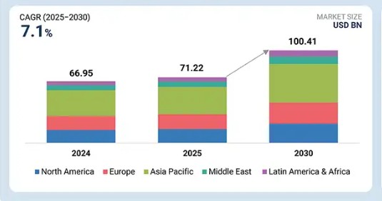 전 세계 액추에이터 시장은 예측 기간 동안 연평균 성장률(CAGR) 7.1%로 2025년 712억 2천만 달러에서 2030년까지 1,004억 1천만 달러로 성장할 것으로 예상됩니다. 자동화에 대한 수요 증가와 효율적인 제어 시스템의 필요성은 액추에이터 산업을 주도하는 핵심 요소입니다. 전기 액추에이터 개발 및 IoT·AI와의 통합과 같은 기술 발전은 액추에이터의 기능과 적용 범위를 더욱 확장하는 데 기여하고 있습니다.