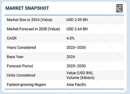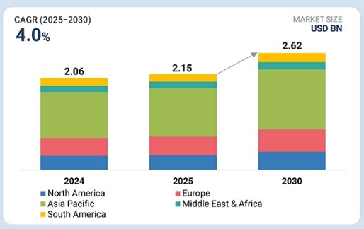 알루미늄 금속 분말 시장은 2025년 21억 7천만 달러에서 2030년까지 연평균 복합 성장률(CAGR) 4.0%로 성장하여 26억 4천만 달러에 달할 것으로 전망된다. 이는 AAC 블록 및 내화물과 같은 건축 자재의 소비 증가, 자동차 및 항공우주 응용 분야의 경량 부품 수요 증가, 또한 적층 제조 및 열분무 코팅 분야에서 분무 분말의 사용이 증가하고 있습니다. 전기차 및 전자제품 생산 확대와 함께 고순도 및 특수 합금 분말의 발전은 주요 지역 전반에 걸쳐 꾸준한 시장 성장을 더욱 뒷받침하고 있습니다.