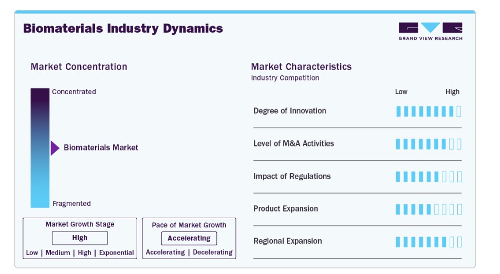 첨단 수술 기법의 부상최소 침습적이고 기술적으로 진보된 수술 기법으로의 글로벌 전환은 생체재료 수요를 가속화하는 주요 동인이다. 의료 서비스 제공자들은 입원 기간 단축, 수술 후 합병증 감소, 환자 회복 기간 개선 효과로 인해 최소 침습적 기법을 점점 더 많이 채택하고 있다. 이러한 수술에는 경량, 고강도, 생체 적합성, 그리고 종종 생체 흡수성을 갖춘 고도로 전문화된 생체재료가 필요하다. 그 결과 정형외과, 심혈관 및 일반 수술 분야에서 첨단 폴리머, 복합재 및 생체활성 재료에 대한 수요가 꾸준히 증가하고 있습니다. 로봇 보조 수술, 영상 유도 중재술 및 카테터 기반 시술의 확대는 우수한 기계적·생물학적 성능을 지닌 정밀 설계 생체재료에 대한 필요성을 더욱 강화하고 있습니다. 이러한 시술에 사용되는 생체재료는 안전성과 장기적 기능성을 보장하기 위해 향상된 유연성, 제어된 분해 특성, 강력한 조직 상호작용을 제공해야 합니다. 이는 생분해성 스텐트, 최소 침습 정형외과 임플란트, 연조직 스캐폴드 분야의 혁신을 주도하며, 외과의가 시술 정확도를 높이고 환자 결과를 개선할 수 있도록 합니다. 또한 환자 인식 제고, 의료 접근성 향상, 만성 질환 부담 증가가 첨단 수술 솔루션의 광범위한 채택을 촉진하고 있습니다. 재활 비용과 재수술률을 낮추는 장기적 비용 효율성으로 인해 최소 침습적 시술이 선호되고 있습니다. 이러한 수술 관행의 구조적 변화는 고성능 생체재료에 대한 지속적인 수요를 강화하여 글로벌 생체재료 산업의 핵심 성장 동력이 되고 있습니다. 기술 발전기술 혁신은 생체재료 시장의 성장을 크게 가속화하고 있으며, 새로운 연구는 생체 적합성, 항균 성능 및 재생 잠재력 향상에 초점을 맞추고 있습니다. 망간 도핑된 산화아연 나노입자로 기능화된 티타늄 임플란트와 같은 신소재는 강력한 항균 활성을 보여주면서 조직 재생을 지원합니다. 이러한 다기능 특성은 임플란트 관련 감염 및 불량한 골유착과 같은 주요 과제를 해결하여 첨단 생체재료가 개선된 임상 결과를 가능하게 하는 핵심 요소로 자리매김하게 합니다. 정형외과 질환 유병률 증가, 치과 및 구강악안면 임플란트 사용 확대, 최소 침습적 시술 선호도 상승이 시장 수요를 더욱 강화하고 있다. 고령화 인구와 만성 질환 발생률이 증가함에 따라 의료 제공자들은 환자 회복을 촉진하고 재수술 필요성을 줄이는 내구성 있고 고성능의 생체재료 사용을 우선시하고 있다. 동시에 적층 제조 및 정밀 표면 공학을 포함한 제조 기술의 발전은 확장성과 맞춤화를 개선하여 상용화를 가속화하고 있습니다. 이러한 혁신들은 기술적으로 진보된 생체재료가 시장 확장의 핵심 동력으로 자리매김하도록 하고 있습니다. 보고서 범위 및 제공 내용시장 집중도 및 특성생체활성 재료, 나노기술 기반 코팅, 생분해성 폴리머 분야의 지속적인 발전을 바탕으로 생체재료 산업의 혁신 강도는 여전히 높은 수준을 유지하고 있습니다. 재생 의학, 맞춤형 임플란트, 감염 저항성 재료에 대한 관심이 증가하면서 제품 혁신이 가속화되고 있습니다. 선도적 제조업체들의 강력한 연구개발 투자와 첨단 수술 기술의 신속한 도입은 시장의 높은 혁신 모멘텀을 더욱 강화하고 있습니다. 생체재료 산업은 제품 포트폴리오 확장, 신기술 확보, 신규 지역 시장 진출을 목표로 한 전략적 협력을 주된 동력으로 중규모의 인수합병(M&A)을 경험해 왔습니다. 주요 기업들은 재생의학 및 최소 침습 수술 솔루션과 같은 고성장 분야에서의 입지를 강화하기 위해 스타트업 및 혁신적 소재 개발사 인수에 주력하고 있습니다. 그러나 높은 규제 감독과 생체재료 기술의 특수성으로 인해 대규모 통합은 여전히 제한적입니다. 규제 프레임워크는 생체재료 시장 형성에 중요한 역할을 합니다. FDA, EMA, ISO 등 기관이 설정한 엄격한 안전성, 유효성, 생체적합성 기준 준수는 제품 개발 일정, 승인 절차, 상용화 전략에 영향을 미칩니다. 규제는 환자 안전과 품질을 보장하지만, R&D 비용 증가와 시장 진입 지연 요인이 되기도 합니다. 규제 전문성과 초기 임상 검증에 투자하는 기업은 경쟁 우위를 확보하여 혁신적 생체재료의 신속한 채택을 촉진합니다. 생체재료 기업들은 다양한 의료 분야 적용을 포착하기 위해 제품 확장에 점점 더 집중하고 있습니다. 혁신적인 제품으로는 생체흡수성 폴리머, 나노코팅 임플란트, 정형외과, 심혈관 의학, 치과, 재생의학에 사용되는 다기능 복합재 등이 있습니다. 제품 포트폴리오를 확대함으로써 제조업체는 특정 임상적 요구를 해결하고, 환자 치료 결과를 개선하며, 경쟁 시장에서 차별화할 수 있습니다. 지리적 다각화는 아시아 태평양, 중동, 라틴 아메리카의 고성장 잠재력을 지닌 신흥 시장에 초점을 맞춘 핵심 성장 전략으로 남아 있습니다. 의료 인프라 확충, 환자 인식 제고, 첨단 수술 기법의 확산이 이들 지역의 수요를 견인하고 있습니다. 신규 지역으로의 진출은 시장 참여자들이 성장 기회를 포착하는 동시에 북미 및 유럽 성숙 시장에 대한 의존도를 낮출 수 있게 합니다. 제품 인사이트금속 부문은 기계적 