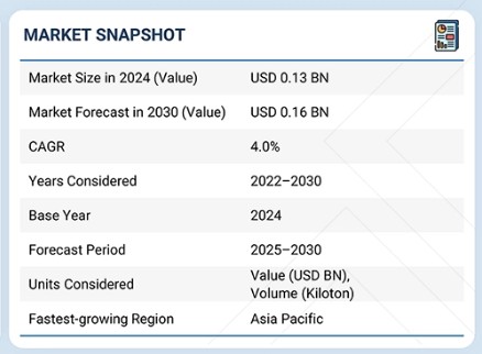 칼슘 아세테이트 시장은 2025년 1억 4천만 달러에서 2030년까지 1억 6천만 달러로 성장할 것으로 전망되며, 예측 기간 동안 연평균 성장률(CAGR)은 4.0%를 기록할 것으로 예상됩니다. 칼슘 아세테이트 시장 성장은 주로 제약 및 기능성 식품 분야의 수요에 의해 주도됩니다. 칼슘 아세테이트가 산도 조절제 및 방부제로 사용되는 가공 및 강화 식품에 대한 수요가 증가하고 있습니다.