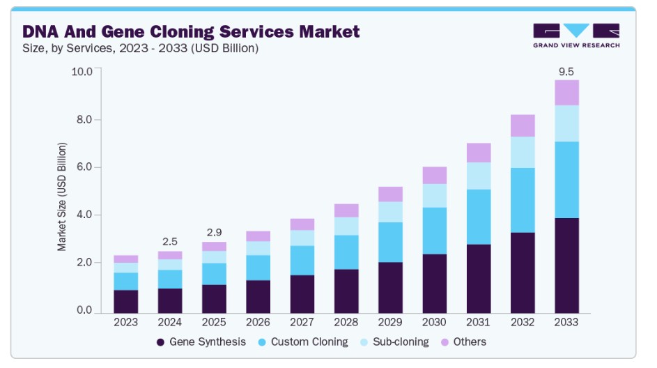 | ■ 영문 제목 : DNA And Gene Cloning Services Market Size, Share & Trends Analysis Report By Service (Gene Synthesis, Custom Cloning, Sub-Cloning), By Application (DNA Sequencing, Mutagenesis, Genotyping), By End Use, By Region, And Segment Forecasts, 2025 - 2033 | |