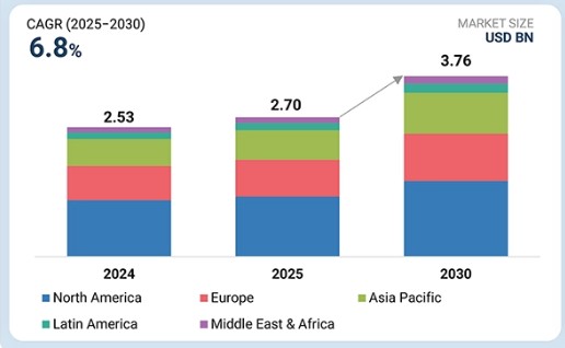 전 세계 심전도 케이블 및 리드선 시장은 2025년 27억 달러에서 2030년까지 37억 6천만 달러에 달할 것으로 전망되며, 예측 기간 동안 연평균 복합 성장률(CAGR) 6.8%로 성장할 것으로 예상됩니다. 이러한 꾸준한 성장은 전 세계적으로 고령 인구가 증가하고 심혈관 질환 유병률이 높아짐에 따라 주도되고 있습니다. 노년층은 심장 질환에 더 취약하기 때문에 정확하고 지속적인 심전도 모니터링에 대한 필요성이 급속히 증가하고 있습니다. 또한 신호 정확도 향상, 제품 내구성 강화, 일회용 리드 시스템 도입과 같은 기술 발전이 시장 채택을 가속화하고 시장 성장을 뒷받침하고 있습니다.