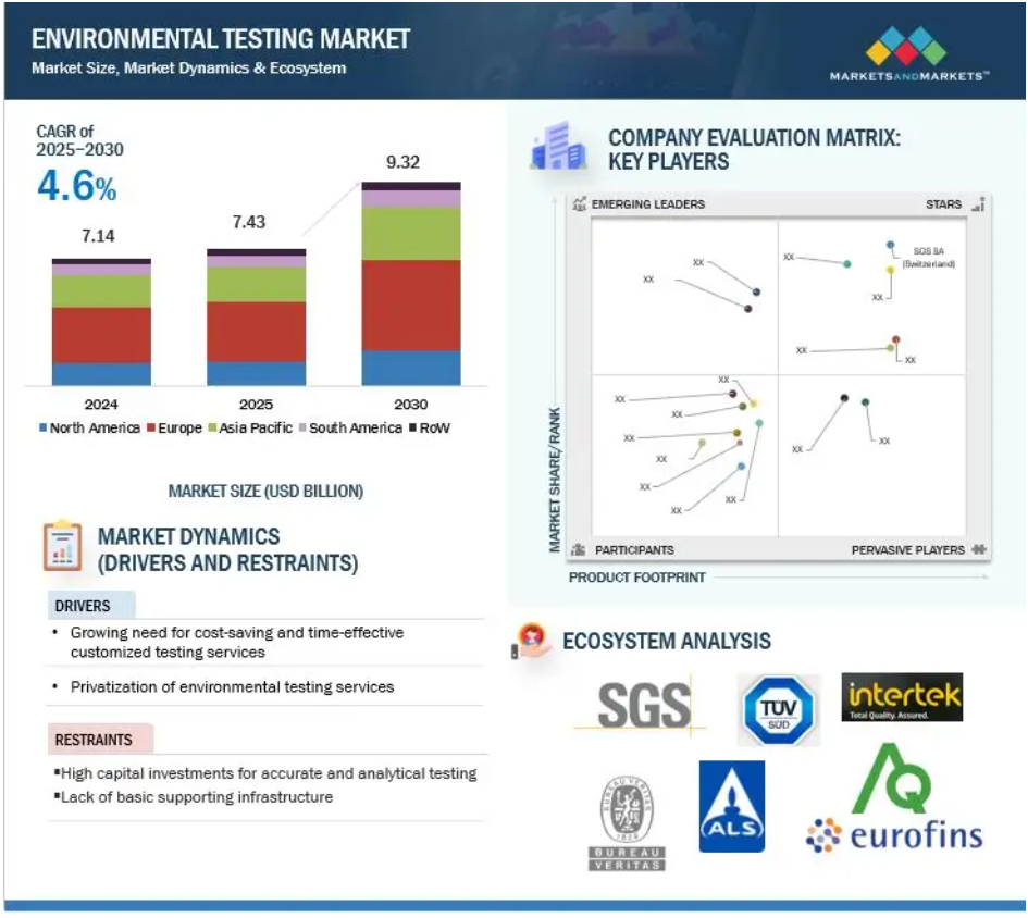 비용 절감 및 효율적인 맞춤형 테스트 서비스에 대한 수요가 환경 테스트 시장을 주도하고 있습니다. 기업과 규제 기관은 예산을 초과하거나 지체 없이 환경 규정을 준수할 수 있는 더 스마트하고 효과적인 방법을 모색하고 있습니다.