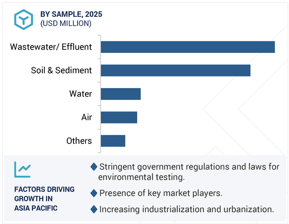테스트된 샘플을 바탕으로, 폐수/폐수 처리 부문은 예측 기간 동안 가장 높은 CAGR로 성장할 것으로 추정됩니다. 폐수 및 폐수 처리는 현재 환경 테스트 시장의 주요 구성 요소입니다. 전 세계적으로 엄격한 정부 법규에 따라 산업체와 지방 정부가 배출 기준을 준수하도록 하기 위해 반복적인 테스트가 필요합니다. 이러한 규정은 위험한 오염 물질이 수역과 생태계를 오염시키는 것을 방지하기 위해 제정되었으므로, 환경과 공중 보건을 보호하기 위해 폐수 테스트가 필요합니다. 또한 실시간 모니터링을 포함한 검사 기술의 발전으로 폐수 검사가 더욱 효율적이고 정확하며 비용 효율적으로 개선되었습니다. 이러한 발전으로 인해 기업과 지자체가 필요한 검사를 더 쉽게 수행하고 규정을 준수할 수 있게 되었습니다. 환경 지속 가능성과 건강에 대한 대중의 관심이 높아짐에 따라 더 많은 기업이 검사에 투자하게 되었고, 이로 인해 검사의 범위가 확대되었습니다.