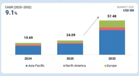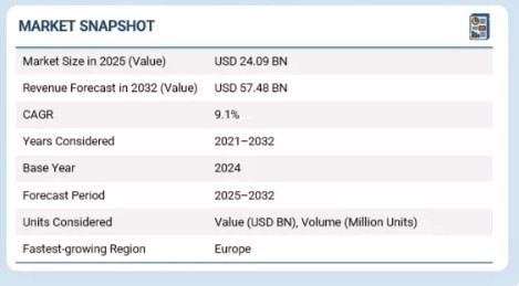 전기차 반도체 시장은 2025년 240억 9천만 달러에서 2032년 574억 8천만 달러로 연평균 복합 성장률(CAGR) 9.1%를 기록하며 성장할 것으로 전망됩니다. 시장 성장은 소프트웨어 정의 차량으로의 전환, 높은 수준의 자율 주행, 800V 아키텍처 채택, SiC 및 GaN과 같은 와이드 밴드갭 반도체 기술로의 전환에 의해 주도되고 있습니다. 미국의 관세 및 중국의 핵심 소재 수출 통제를 포함한 무역 긴장은 반도체 현지화 및 공급망 다각화를 위한 노력을 가속화하여 지속적인 시장 확장을 뒷받침하고 있습니다.