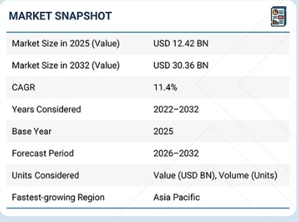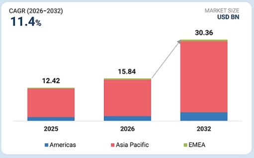 극자외선(EUV) 리소그래피 시장은 2026년 158억 4천만 달러에서 2032년 303억 6천만 달러로 연평균 복합 성장률(CAGR) 11.4%를 기록하며 성장할 것으로 전망됩니다. 7nm, 5nm 및 차세대 기술을 포함한 최첨단 파운드리 노드로의 가속화된 전환은 전 세계 반도체 산업 전반에 걸친 EUV 리소그래피 채택의 핵심 동인이다. 기존 광학 리소그래피 방식이 10nm 미만 기하 구조에서 해상도와 패턴 충실도에 근본적인 한계에 직면함에 따라, EUV 리소그래피는 더 정밀한 특징, 더 좁은 피치 및 점점 더 복잡해지는 소자 구조 구현에 필수불가결한 기술이 되었다.