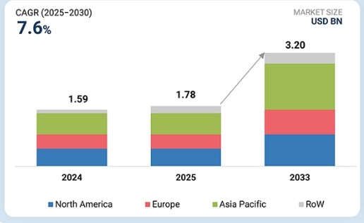 가스 센서 시장은 2025년 17억 8천만 달러에서 2033년까지 연평균 복합 성장률(CAGR) 7.6%로 성장하여 32억 달러에 달할 것으로 예상됩니다. 자율주행차 수요 증가, 사물인터넷(IoT), 클라우드 컴퓨팅 및 빅데이터 기술 통합으로 인해 시장이 크게 성장하고 있습니다. 또한 소비자 가전 제품에서의 채택 증가와 소형화된 무선 가스 센서에 대한 수요 증가는 시장 확장의 기회를 제공하고 있습니다.