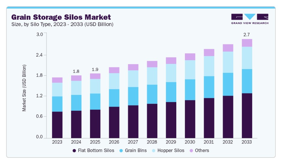| ■ 영문 제목 : Grain Storage Silos Market Size, Share & Trends Analysis Report By Silo Type (Flat Bottom Silos, Hopper Silos, Grain Bins), By Storage Capacity (Up To 1,000 Tons, 1,000 To 5,000 Tons), By Material, By End Use, By Operation Type, By Region, And Segment Forecasts, 2025 - 2033 | |