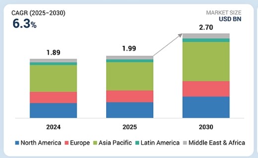 중주파 자기 부품 시장은 2025년 19억 9천만 달러, 2030년 27억 달러 규모에 달할 것으로 예상되며, 예측 기간(2025-2030년) 동안 연평균 복합 성장률(CAGR) 6.3%를 기록할 전망이다. 시장 성장은 재생 에너지 시스템, 전기차, 첨단 전력 변환 기술의 확산에 힘입어 추진되고 있으며, 이러한 기술들은 효율적이고 소형화된 자기 부품이 필요하다. 에너지 효율적 인프라, 산업 자동화, 데이터 센터 전력 시스템에 대한 투자 증가가 수요를 더욱 가속화하고 있습니다. 또한 항공우주, 의료, 통신, 자동차 산업 등에서 성능 향상, 손실 감소, 소형화 지원을 위해 중주파 변압기와 인덕터를 점점 더 많이 통합함에 따라, 중주파 자기 부품은 차세대 전력 전자 응용 분야에서 필수적입니다.