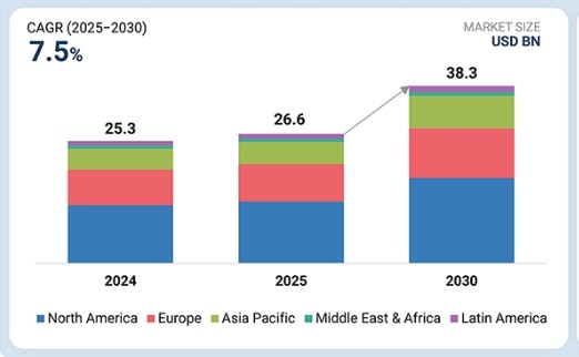 글로벌 미세플라스틱 분석 시장은 상당한 성장을 보일 것으로 예상되며, 2025년 2억 6,690만 달러에서 2030년 3억 8,310만 달러로 증가하여 연평균 복합 성장률(CAGR) 7.5%를 기록할 것으로 전망됩니다. 미세 플라스틱 분석용 시약 및 소모품 수요는 수질, 식품, 소비재 산업 전반에 걸친 강화된 환경 규제와 증가된 모니터링 요구사항에 의해 주도되며, 이는 빈번하고 정확한 테스트를 필요로 합니다. 미세 플라스틱 오염에 대한 대중 및 산업계의 인식 제고와 표준화되고 재현 가능한 결과에 대한 요구가 결합되면서 실험실들은 고품질 시약, 필터, 염료 및 교정 표준을 사용하도록 촉진되고 있습니다. 또한 형광 염색, 분광법, 자동화 이미징과 같은 분석 방법의 기술 발전은 특수 소모품에 의존합니다. 연구 기관, 계약 시험실 및 산업 최종 사용자의 증가 역시 지속적인 소비와 시장 성장을 뒷받침하고 있습니다.