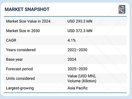 벤조산나트륨 시장은 2025년 3억 490만 달러에서 2030년까지 연평균 성장률(CAGR) 4.1%를 기록하며 3억 7,230만 달러 규모에 이를 것으로 전망된다. 이 시장은 식품 및 음료 산업을 비롯한 다양한 산업 분야에서 방부제로 광범위하게 사용됨에 따라 성장하고 있으며, 특히 포장된 즉석식품 및 장기 유통기한 제품에 대한 수요 증가가 소비를 크게 촉진하고 있습니다.